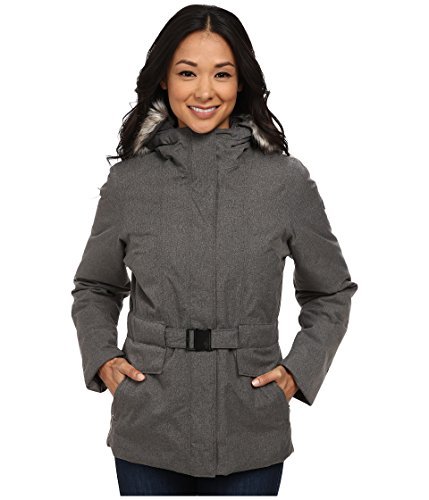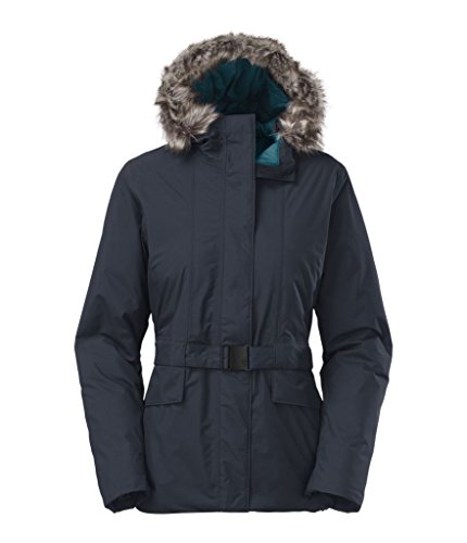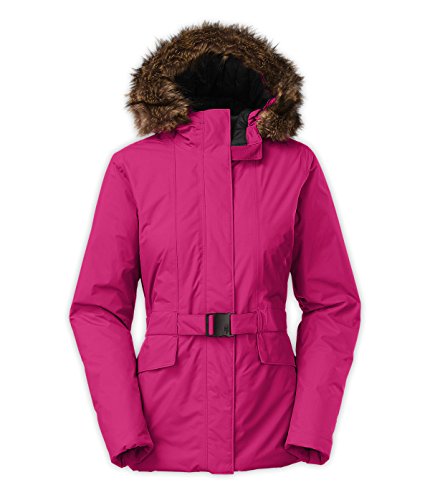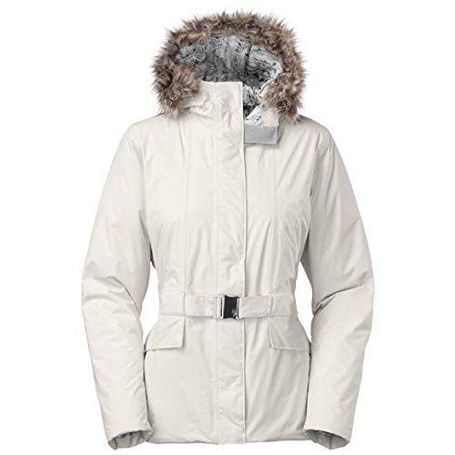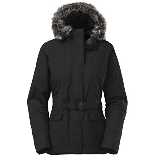 Navigate the city streets warmly in this waterproof, 550-fill down insulated jacket from The North Face. Finished with a flattering belted waist. Features include: Fixed adjustable hood with removable fur brim Angled side-entry hand pockets with faux flap Center front zip with hidden snap placket Partial elastic belt with removable metal buckle Internal media pocket with cord guide Embroidered logo on wearer's left chest Key fob Solid shell: HyVent 2L100% nylon. Heather shell: 100% polyester. Lining: 100% recycled polyester. Insulation: 550 fill down. ImportedFeature