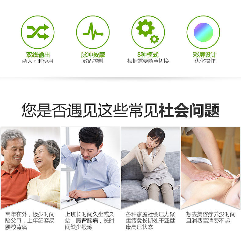 产品功能:模拟揉捏、推拿、锤击、挤压等按摩手法