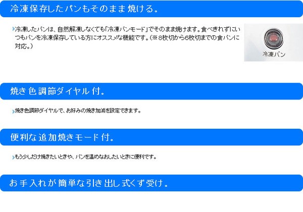 冷凍したパンは、自然解凍しなくても「冷凍パンモード」でそのまま焼けます。食べきれずにいつもパンを冷凍保存している方にオススメな機能です。(※8枚切から6枚切までの食パンに対応。)