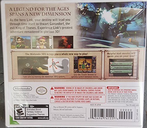 -. Binding : Video Game -. Brand : Nintendo -. EAN : 0632674441072 -. ESRBAgeRating : Everyone -. Feature : World Edition Game -. Genre : Adventure-Game-Genre -. HardwarePlatform : Nintendo_3DS -. Label : Nintendo -. Manufacturer : Nintendo -. MPN : 045496741556UAE -. PackageQuantity : 1 -. PartNumber : 045496741556UAE -. ProductGroup : Video Games -. ProductTypeName : CONSOLE_VIDEO_GAMES -. Publisher : Nintendo -. Studio : Nintendo -. Title : The Legend of Zelda and the Ocarina of time for NINTENDO 3DS -. UPC : 632674441072