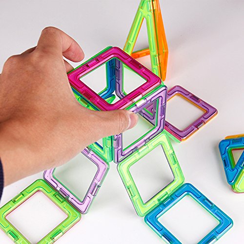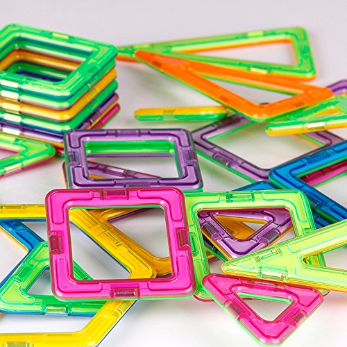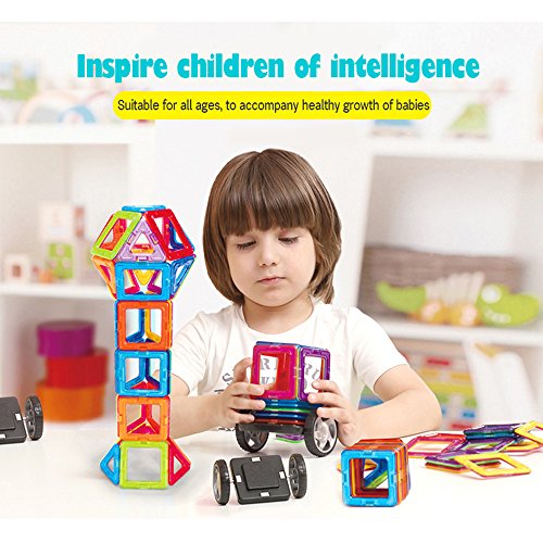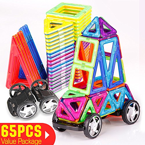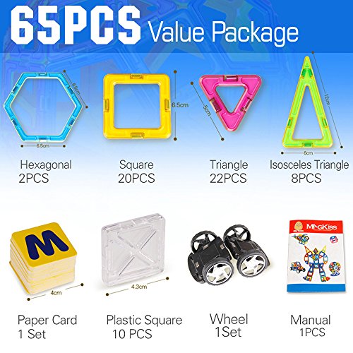 -. Feature : Total 65PCS: Square*20, Triangle*22, Isosceles Triangle*8, Hexagonal*2,Plastic Square*10, Paper Card*1set, Car Wheel*2(Include 1pc Manual) / Made by top brand new ABS + magnetic ,non-toxic,no smell,100% safe for kids / Comes in a beautiful variety of magnetic tiles colors that appeal to boys and girls of all ages / With a Non-woven bag for storage,perfect for use at home, in schools and day care centers. / For Kids 3+