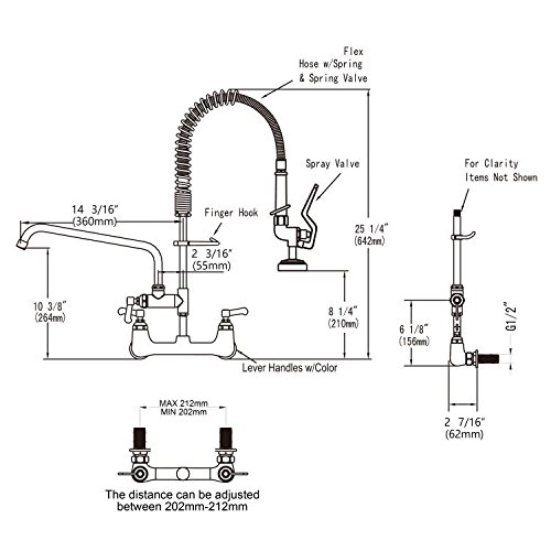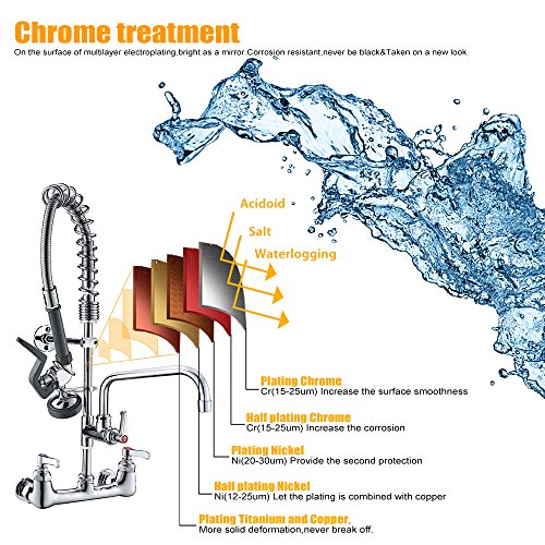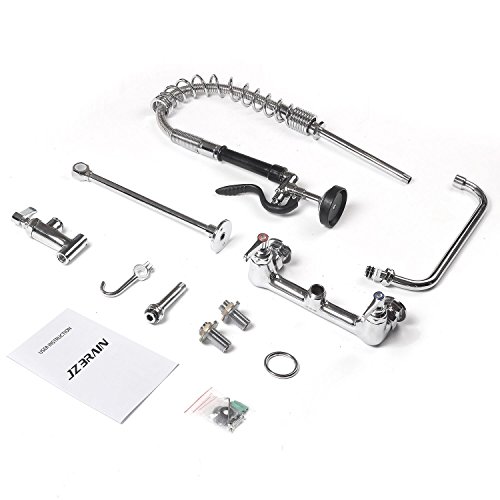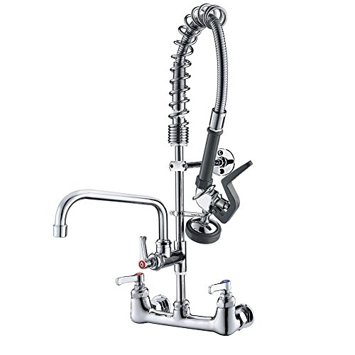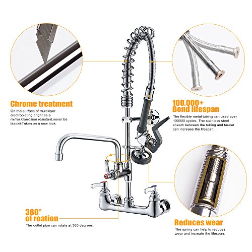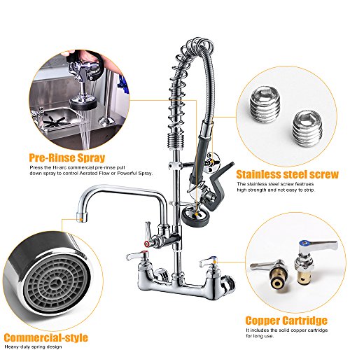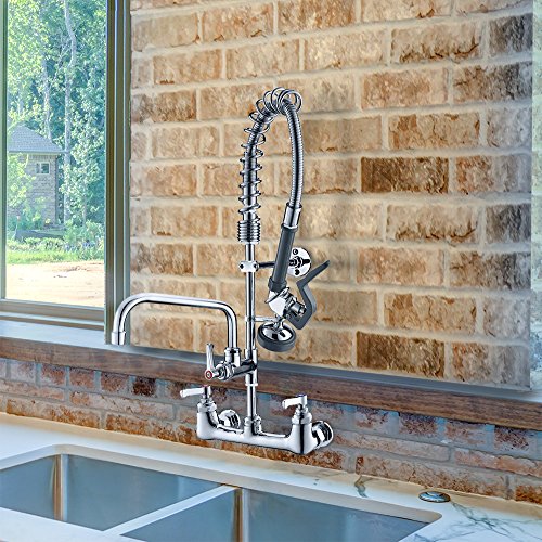 JZBRAIN Double Handle Commercial Kitchen Faucet 25" Height 8" Center Wall Mount Faucet with Pull Down Pre-rinse Spray and Add-on Swing Spout