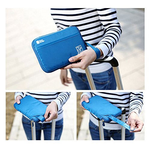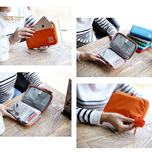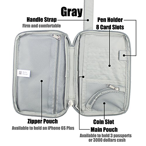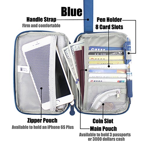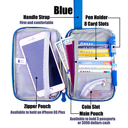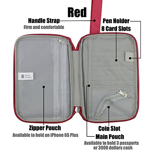 Package Content: 1 Pack of Passport Wallet Travel Pouch Cards Organizer Zipper Case Phone Cash Holder Material: Rip-stop Nylon Printed with Floral Patterns Length: 7.2 inch Width: 5 inch Thickness: 0.75 inch Colors Available: Blue, Green, Red and Gray Design Detail: 1 fixed firmly handle strap 2 outer pouch for quick access 1 inner full length pouches which is roomy enough to hold 3000 dollars cash or 3 passports. 1 zipper pocket inside of full length, which can hold a 5.5 inch screen phone like iPhone 6S Plus. 8 card slots Use: This passport wallet is soft and smooth. It is aimed for individual with small size, but you will surprise to find that its capacity is amazing. The passport wallet looks slim after being filled fully. As its handle strap is fixed and wide, it is comfortable to hold round your wrist. 0