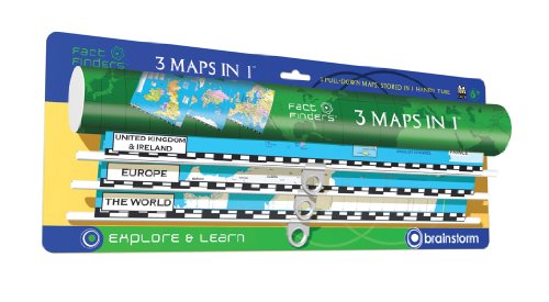 Studio : Brainstorm Publisher : Brainstorm Binding : Toy Product Description The Fact Finders 3 Maps in 1 is a fantastic map for keeping kids entertained at home and is a wonderful resource for the classroom. The three pull down maps are stored in a handy tube and are made from strong, tear-proof plastic. The maps show the UK and Ireland, Europe and The World in an original and colourful design. 3 Maps in 1 is perfect to use when learning or simply finding the location of any country and also to help with geography homework. The maps can be locked open for display and the innovative retraction system allows the maps to be safely kept inside the tube for travel or storage. Fact Finders 3 Maps in 1 can be displayed on a wall or the back of a door or used as a handheld map, rather like a scroll. Fact Finders products put thousands of geographic facts at your fingertips. 40CM WIDE AND 40CM LONG AGE 6 0