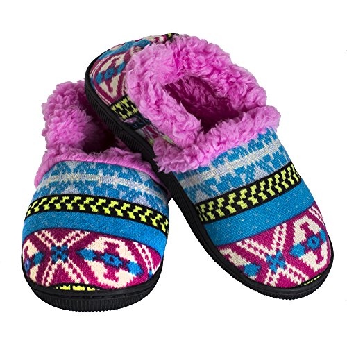 -. Binding : Apparel -. Brand : Snoozies -. Department : womens -. Feature : Snoozies! Hard sole slippers are perfect for walking the dog or getting the morning paper / Comfy fully cushioned pom pom Sherpa insole / Skid resistant hard sole bottoms / Womens shoe sizing as follows: Small (5-6), Medium (7-8), Large (9-10) and Extra-Large (11-12) / Fun blends of colors to choose from -. ProductGroup : Shoes -. ProductTypeName : SHOES -. Title : Snoozies Womens Nordic Knit Indoor Outdoor Cushioned Hard Sole Slippers