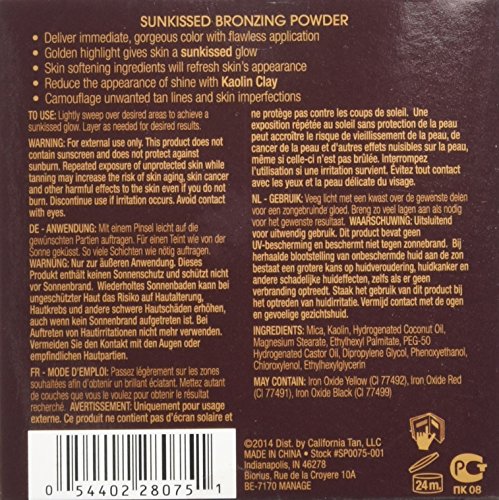 Instant bronze color with a sun kissed glow with the California Tan Sun kissed Bronzing Powder. Delivers immediate, gorgeous bronze color. Imparts a golden, sun kissed glow. Reduce the appearance of shine with Kaolin Clay. Leaves skin soft and smooth to the touch. Includes brush in the bottom of compact. This bronzing powder is fragrance Free.Feature