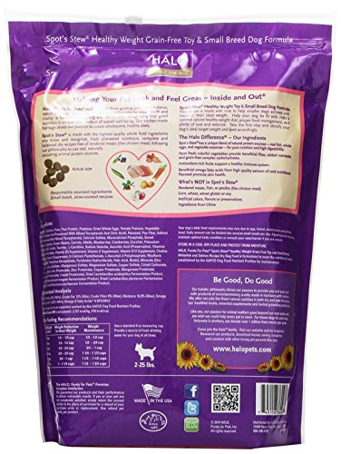 - Feature : Natural Whole Food Ingredients - with added vitamins, minerals and trace nutrients / No artificial colors, flavors or preservatives / Smaller kibble for little mouths / Complete and balanced optimal calorie formula / The Halo Difference No chicken Meal, Rendered Meats, By-Product Meal; Made in the USA