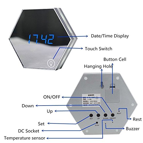 - Display: Time (12/24), Calendar (MM/DD), Temperature (C/F), Alarm (ON/OFF) ; Real bigger flat mirror screen,bold typeface,clear and comfortable visual sense technology, make sure you can see exactly the time without troubling sleep.