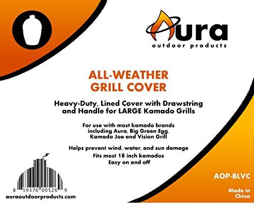 -. Brand : Aura Outdoor Products -. Color : beige -. EAN : 0859376005269 -. Feature : Made of 100% Durable Polyurethane 600D Oxford Weave Fabric with PVC Undercoat / Form fitted and Velcro straps to ensure extra-snug fit; Top handle for easy off. / Double-needle stitched seams for durability / Made for most Large kamado grills (18-21" cooking surface diameter) / Comes in an independent zip up reusable pouch -. Label : Aura Outdoor Products -. Manufacturer : Aura Outdoor Products -. Model : AOP-BLVC -. MPN : AOP-BLVC -. NumberOfItems : 1 -. PackageQuantity : 1 -. PartNumber : AOP-BLVC -. ProductGroup : Lawn & Patio -. ProductTypeName : OUTDOOR_LIVING -. Publisher : Aura Outdoor Products -. Studio : Aura Outdoor Products -. Title : Kamado Cover for Large Big Green Egg, Kamado Joe or any 18in Kamado Grill -. UPC : 859376005269