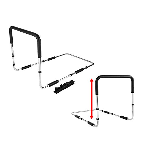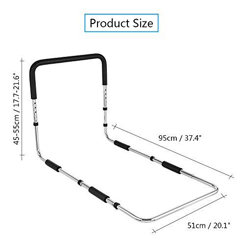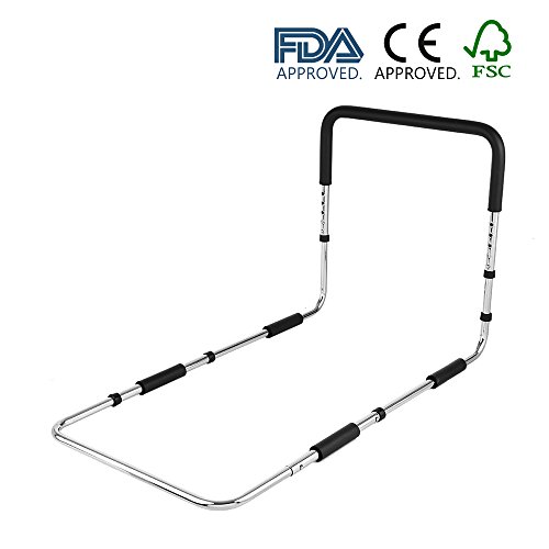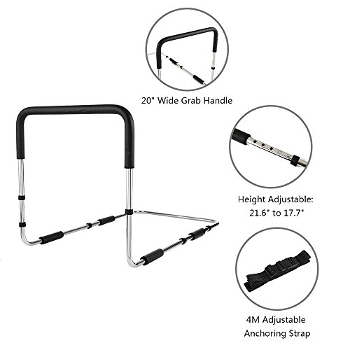 Features: Made of stainless steel, sturdy for durability. Designed to prevent falling by helping users to easily get in or get out of bed. Support 350LB weight, quite heavy-duty. Bottom non-slip sleeve to keep support rail securely under mattress. 20" wide grab handle, features non-slip foam, and 5 level height adjustable from 21.6" to 17.7". Include 4M adjustable anchoring strap, to attach rail to Twin, Full, Queen and King sized beds. Perfect for senior, elderly, disabled, hip recovery or other injuries. Easy to assemble, no tools needed. CE, FDA, and FSC approved, good quality product.