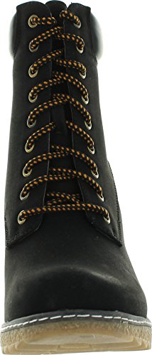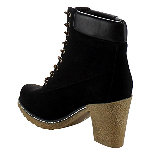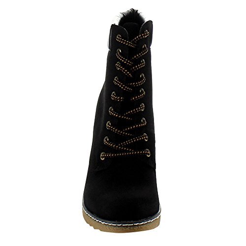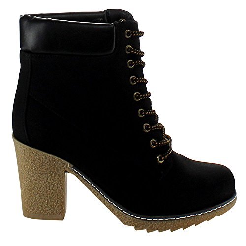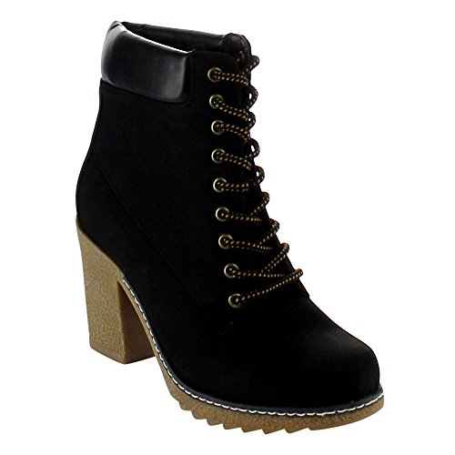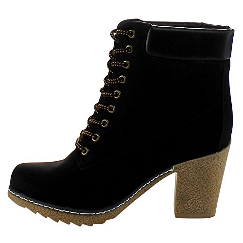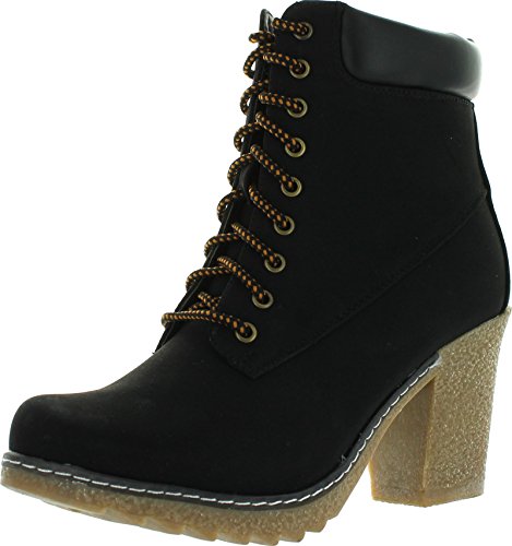 Product Description Throw on a pair of booties and you're good to go. This pair is a solid color with faux leather details. The ankle is cushioned and boots lace up. This boot has a low lug heel. 0