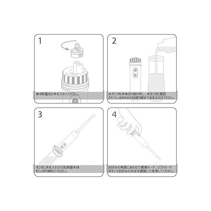 수 탱크 용량:140ml 표준 모드 세정 시간:약60초 소프트 모드 세정 시간:약80초(신품 알카리 건전지 사용 시)