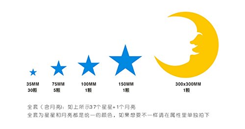 -. Feature : The product include 37pcs stars and a larger moon, the moon size is:30x30cm, the stars size:30pcs 3.5cm, 5pcs 7.5cm,1pcs 10cm, 1pcs 15cm. / There is a protect film on the mirror sticker,once you finished,then tear off the protect film. this acrylic mirror is reflective but not clear and sharp as real mirror. / The color of moon and stars in any combination,if you need, please contact us. / No harm to the environment and health / Easily removable without damaging your wall,Easy to Paste the decal without any messy paint and brushes