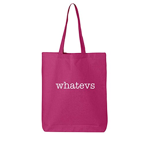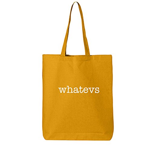 Product DescriptionThis cotton canvas tote bag features "Whatevs" on the front. 15" Wide x 16" High x 3" Deep with 20" handles. Printed in the USA on an imported bag.0