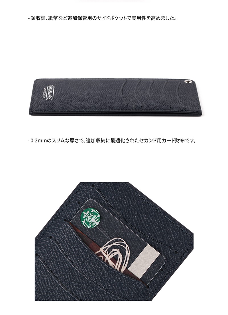 | 商品説明 | スリムに収納できるカードケースです。お財布の仕分けや、ストラップやネックストラップを付けてカードホルダーとしても使用できます。 ※ストラップは付属しません。 |