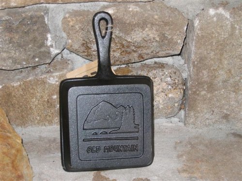 This Old Mountain cast iron skillet is pre seasoned and ready to use. This square skillet is 5 1/2" from spout to spout. The handle on this skillet offers thumb ridges for ease of handling. Cast iron retains heat better than any other cooking media and is the cooking choice of many chefs and home cooks alike. The attractive Old Mountain logo embossed on the bottom of this skillet adds extra style and value.Feature