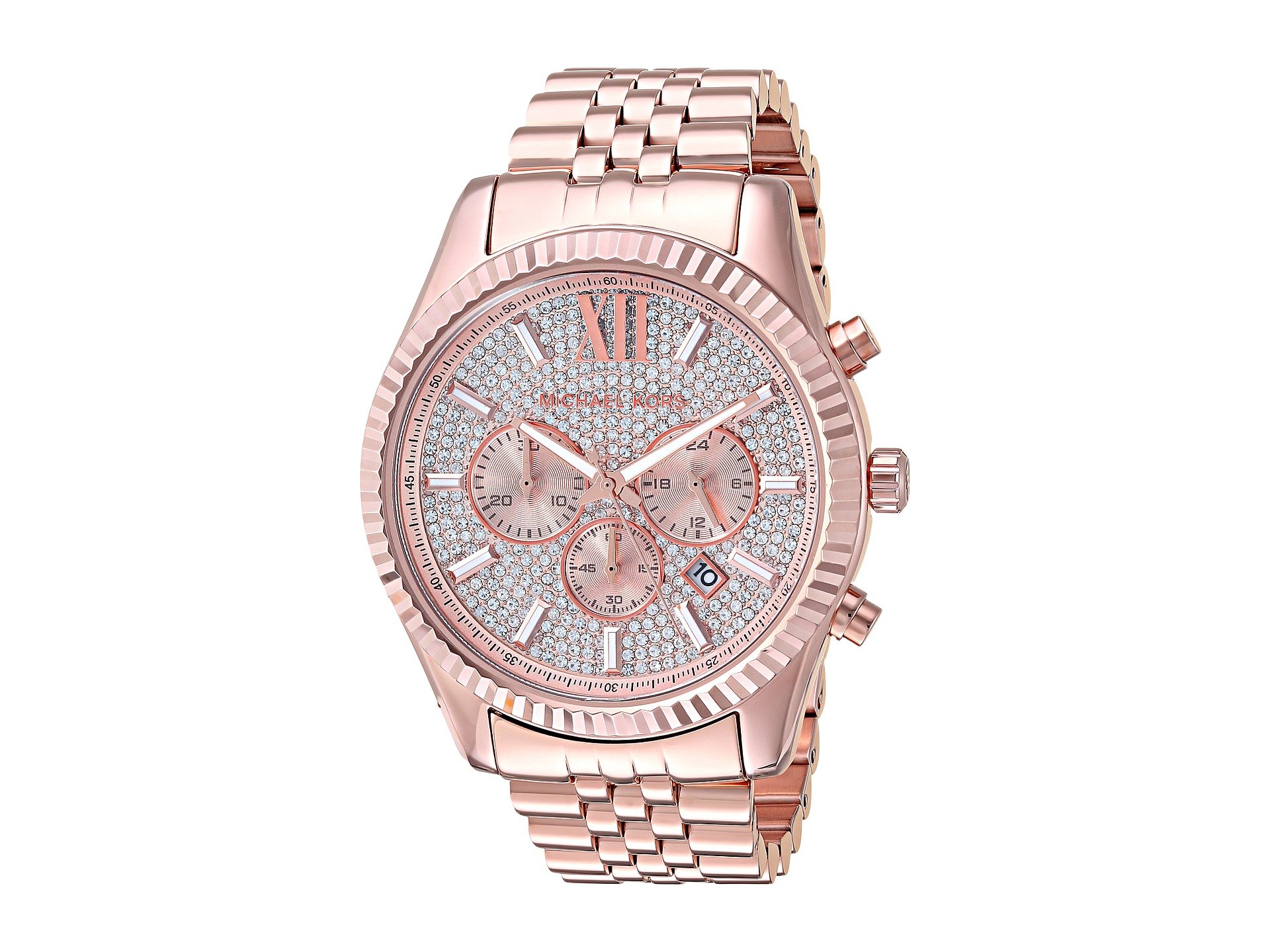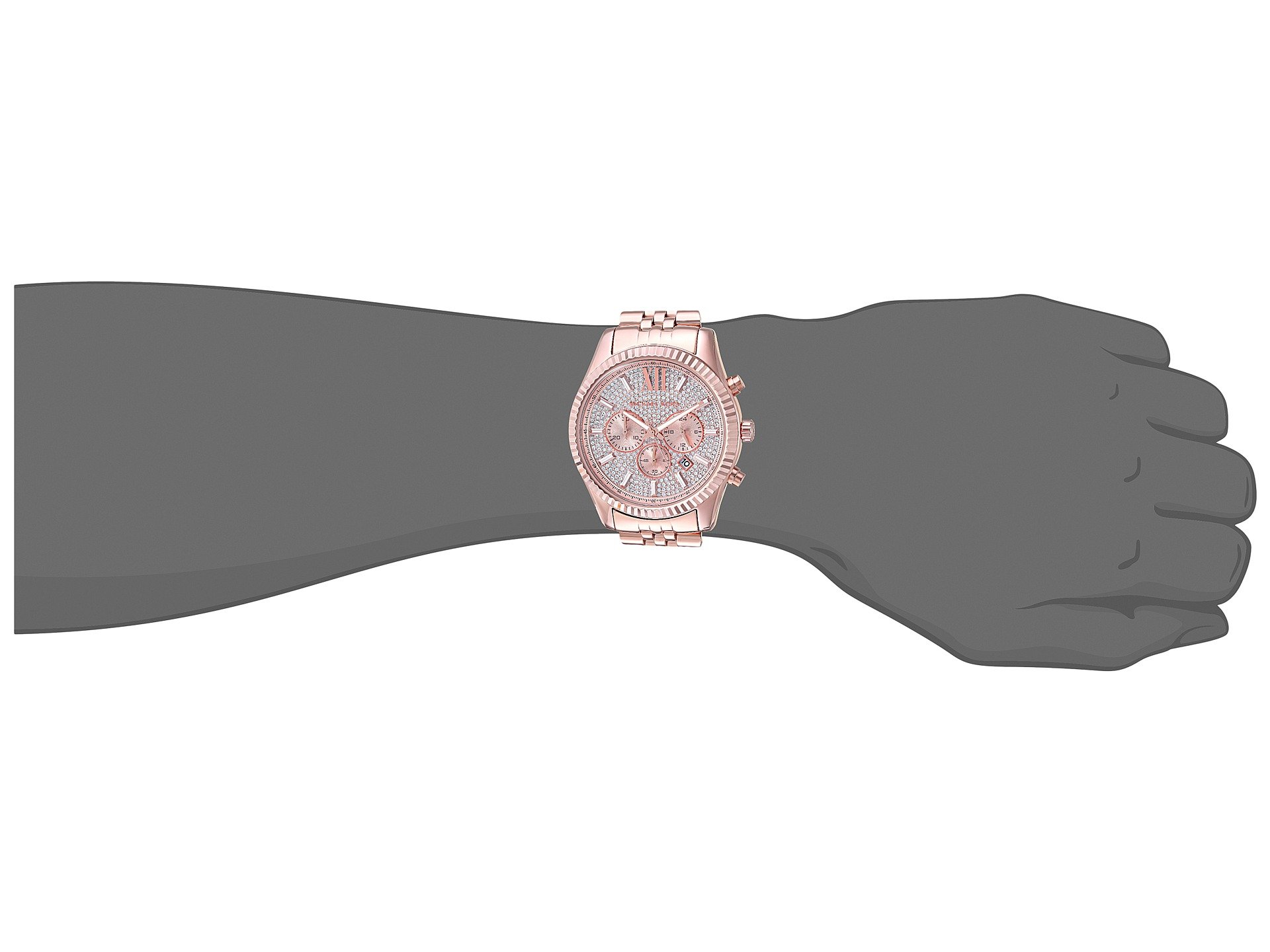 | Product Information SKU: #8942747The rose gold-tone Michael Kors? Lexington watch brings jet-set style to a whole new level. The beveled bezel and rose gold-tone-and-pav?-crystal bracelet provide tactile texture, while the date function and sub-dials complete a dynamic, pav? crystal-studded look.Stainless steel case.Stainless steel bracelet with fold-over, double push-button release. Round face.Three-hand analog display with quartz movement.Dial features rose gold-tone hands and hour markers, 3 subdials, date display window, minute track, and Michael Kors detailing.Chronograph functionality.Water resistant up to 10 ATM.Display case included.Imported.This product may have a manufacturer's warranty. Please visit the manufacturer's website or contact us at warranty@support.zappos.com for full manufacturer warranty details.Measurements: Case Height: 45 mm Case Width: 45 mm Case Depth: 14 mm Band Width: 21 mm Band Circumference/Length: 9 1?2 in Weight: 6 oz |