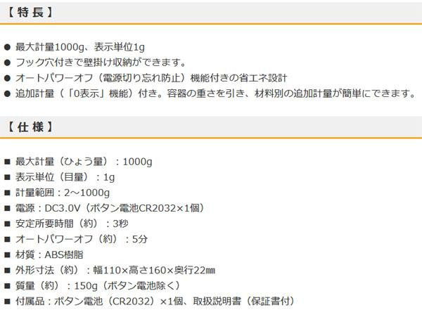 最大計量1kg。収納しやすい小型設計のキッチンスケール☆フック穴付きで、壁掛け収納ができます。オートパワーオフ(電源切り忘れ防止)機能付きの省エネ設計。更に、容器の重さを引いて材料別の追加計量が簡単にできる「0表示」機能付き♪ |