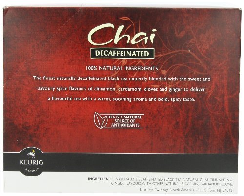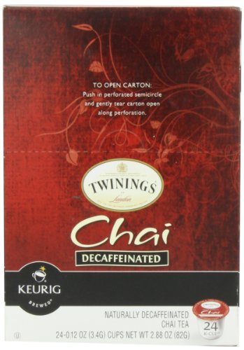 -. Binding : Kitchen -. Brand : Twinings -. EAN : 7152555237370 -. Feature : 24 count / black tea; cinnamon; cardamom; cloves; ginger / A flavourful tea with a warm, soothing aroma and bold, spicy taste / Chai is a term for spiced tea from India (most famous being masala chai); In the United States, / Not compatible with Keurig 2.0 brewers -. Label : Home & Kitchen Store -. Manufacturer : Home & Kitchen Store -. MPN : RKTCH-PN-29578482 -. PartNumber : RKTCH-PN-29578482 -. ProductGroup : Home -. ProductTypeName : HOME -. Publisher : Home & Kitchen Store -. Studio : Home & Kitchen Store -. Title : Twinings Chai Tea K Cup, Decaffeinated, 24 Count Size: 24 Count FlavorName: Decaf Chai Model: 9955 (Home & Kitchen)