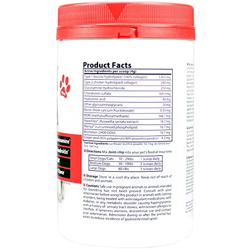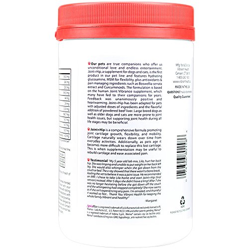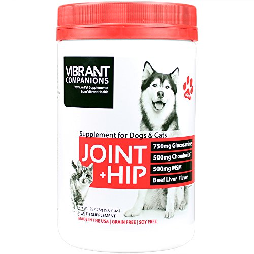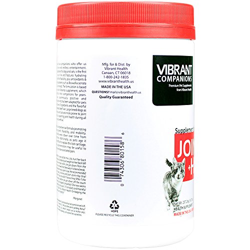 -. Binding : Misc. -. Brand : Vibrant Health -. Label : Vibrant Health -. Manufacturer : Vibrant Health -. PackageQuantity : 1 -. ProductGroup : Pet Products -. ProductTypeName : PET_SUPPLIES -. Publisher : Vibrant Health -. Studio : Vibrant Health -. Title : Vibrant Companions - Joint + Hip - Joint and Hip Support for Dogs and Cats, 9.07 Ounce