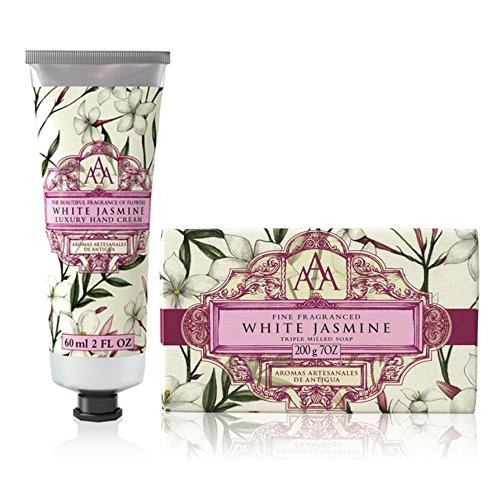 Aromas Artisanales De Antigua "White Jasmine" Floral Soap 200g / 7 ounces. An enticing and clever blend of floral fragrances, these rich, nourishing and delightfully packaged soap bars combine wonderful formulations with seductive scents, leaving your skin cleansed and beautifully fragranced.