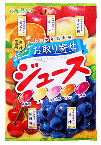 原材料:砂糖、水飴、佐藤錦果汁(山形県産)、ふじ濃縮果汁(青森県産)、巨峰濃縮果汁(長野県産)、せとか果汁(愛媛県産)、清水白桃果汁(岡山県産)/酸味料、香料(オレンジ由来)、着色料(アントシアニン・アナトー・カラメル・クチナシ)