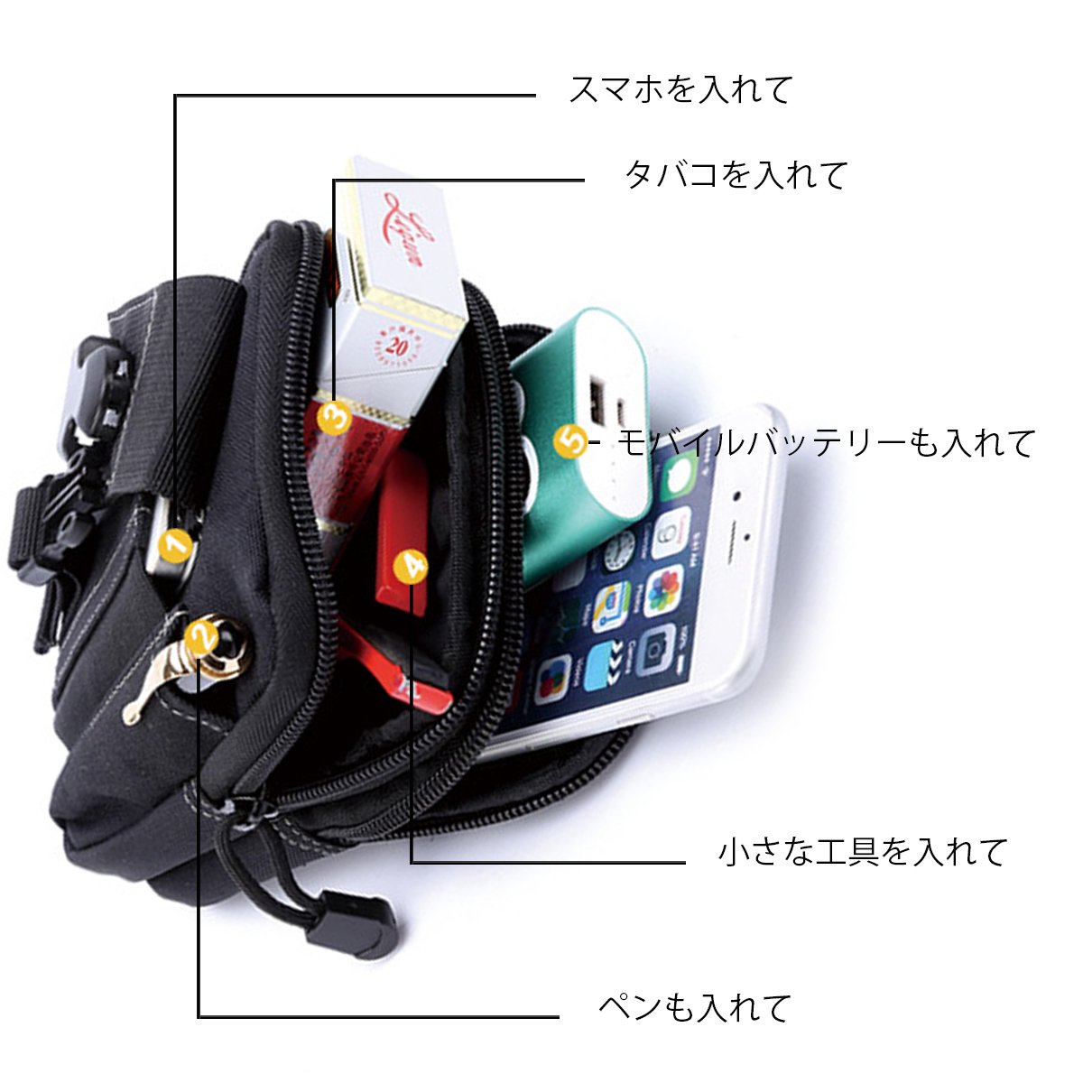 As well as smartphones and chargers, plenty of lights etc. convenient for outdoor storage plenty Main storage part with zippers is no problem ◎ Belt pouch through your belt!