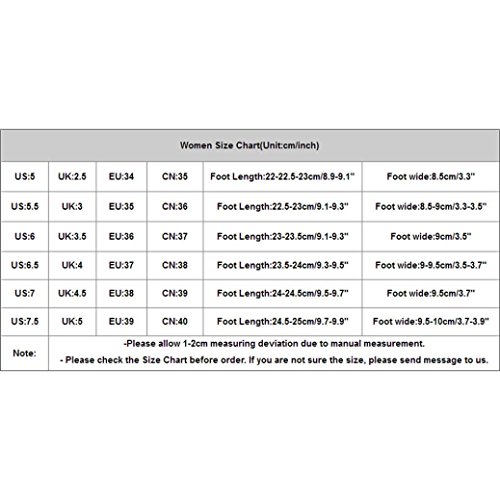 Women Size Chart(Unit:cm/inch) US:5 UK:2.5 EU:34 CN:35 Foot Length:22-22.5-23cm/8.9-9.1" Foot wide:8.5cm/3.3" US:5.5 UK:3 EU:35 CN:36 Foot Length:22.5-23cm/9.1-9.3" Foot wide:8.5-9cm/3.3-3.5" US:6 UK:3.5 EU:36 CN:37 Foot Length:23-23.5cm/9.1-9.3" Foot wide:9cm/3.5" US:6.5 UK:4 EU:37 CN:38 Foot Length:23.5-24cm/9.3-9.5" Foot wide:9-9.5cm/3.5-3.7" US:7 UK:4.5 EU:38 CN:39 Foot Length:24-24.5cm/9.5-9.7" Foot wide:9.5cm/3.7" US:7.5 UK:5 EU:39 CN:40 Foot Length:24.5-25cm/9.7-9.9" Foot wide:9.5-10cm/3.7-3.9" Note: -Please allow 1-2cm measuring deviation due to manual measurement. - Please check the Size Chart before order. If you are not sure the size, please send message to us. 0