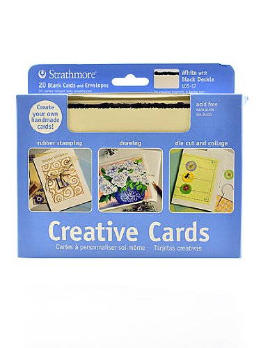 -. Brand : Strathmore -. Color : bright white w/ black deckle -. EAN : 0012017702174 -. Feature : 20 Cards and Envelopes - Acid-free / Larger size cards can be used to design a greeting for any occasion / Cards measure measure 5 x 6-7/8 / Matching envelopes measure 5-1/4 x 7-1/4 / White card with black deckled edge -. Label : Strathmore -. Manufacturer : Strathmore -. MPN : 105-17 -. NumberOfItems : 1 -. PackageQuantity : 1 -. PartNumber : 105-17 -. ProductGroup : Art and Craft Supply -. ProductTypeName : ART_AND_CRAFT_SUPPLY -. Publisher : Strathmore -. Studio : Strathmore -. Title : Strathmore Blank Greeting Cards with Envelopes bright white with black deckle pack of 20 -. UPC : 012017702174