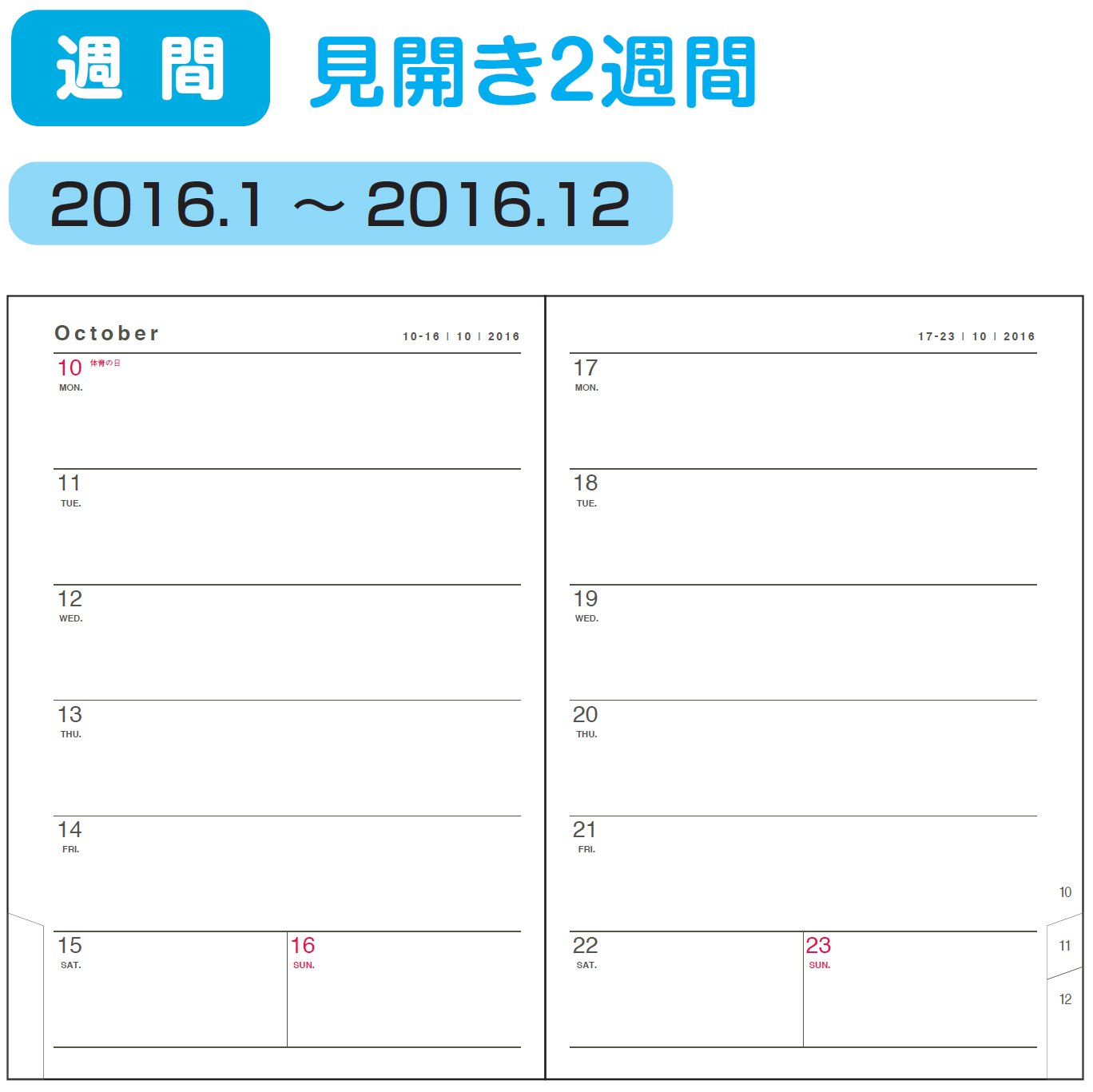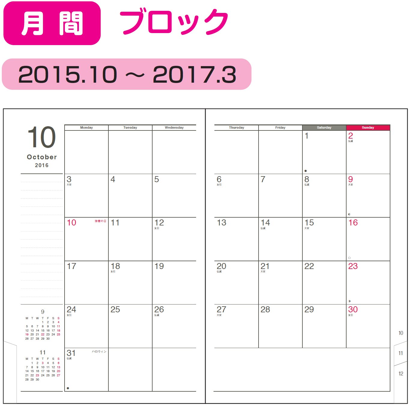 ● It is a notebook with an easy-to-use index that pages are followed immediately by a weekly page after the monthly page.