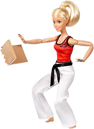 Barbie active sports dolls are ready to compete! Each Barbie Made to Move doll has 22 “joints” -- in the neck, upper arms, elbows, wrists, torso, hips, upper legs, knees AND ankles -- for lots of flexibility and an incredible range of movement! Young athletes will love exploring the world of martial arts with this Barbie doll. The expert black belt is dressed in a career-themed outfit and comes with accessories that add to the storytelling -- and posing -- fun! Barbie martial artist doll is ready to head to the mats wearing a red tank with black trim and martial arts logo paired with white pants and a black belt. A breakable board and silvery trophy highlight her practiced skill. Play out all kinds of stories and show off your moves with Barbie Made to Move martial artist doll. Explore all of the Barbie career dolls because with Barbie, you can be anything (each sold separately, subject to availability). Includes Barbie Made to Move martial artist doll wearing fashions and accessories, plus trophy and board. Doll cannot stand alone. Colors and decorations may vary.Feature