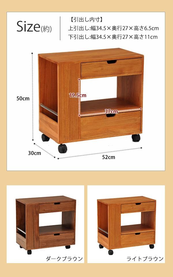 | 仕様 | 完成品(キャスターのみお客様取付) 引出し内寸(約)/上引出し:幅34.5×奥行27×高さ6.5cm、下引出し:幅34.5×奥行27×高さ11cm サイドラック有効サイズ(約):幅27.5×奥行10×高さ42cm キャスター:4個(2個ストッパー付) 引出し両側から開閉可能 |