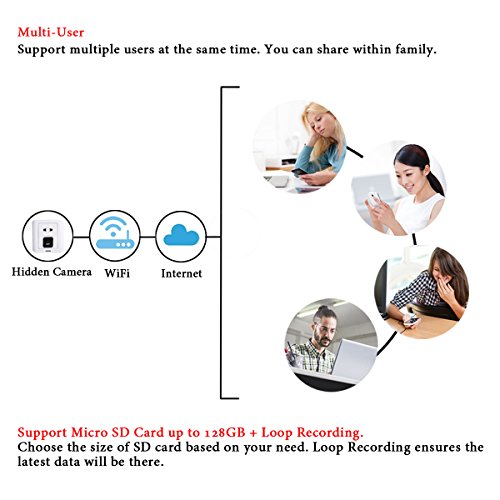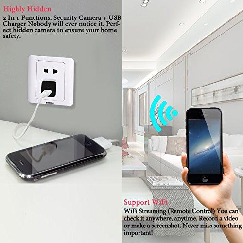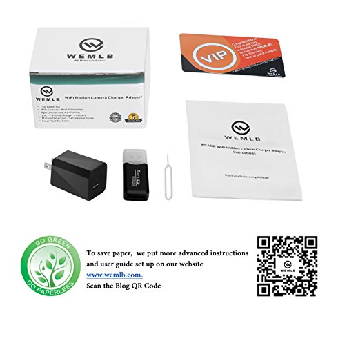 -. Feature : ✔MOST ADVANCED HIDDEN CAMERA MODEL WITH KEY FUNCTIONALITIES - This camera comes with the latest improved motion technology, loop recording technologies, IP WIFI Network function. This spy camera looks and functions exactly like your standard USB wall charging adapter with no indications that it doubles as a hidden camera. You can keep recording your secret video while you are charging your phone in any place. See exactly what is going on while you're not around. / ✔INTELLIGENT HOME SURVEILLANCE, OFFICE SURVEILLANCE - Use the camera as baby monitor, nanny camera, pet monitor to make sure everything is safe and healthy or use it as Hidden video for meeting Recording. This spy camera is very user-friendly, you can get it working effortlessly, just plug it into the power outlet and it starts recording, unplug it and it stops. WASTE NO TIME, Click the ADD TO CART Button Now! / ✔SUPPORT PC VIEW & SMARTPHONE APP REMOTE VIEW/ CONTROL & SMART NOTIFICATION - This hidden camera which is easy to set up via WIFI, offers you the possibility to control and see from your smartphone app or your computer what is happening in real time. Combining with motion detection technology, you can receive notification right on your hand using the APP whenever suspicious activities are detected. Notifications can be also sent to your email. / ✔LARGE STORAGE CAPACITY & LOOP RECOORDING- It is built with micro SD card slot can support up to 128GB memory card (not included), it can be easily and simply replaced. The loop recording technologies allows you to have nonstop recording thus ensuring continuous surveillance recording. / ✔ORDER NOW WITH RISK FREE! 100% SATISFACTION GUARANTEE -The 1080P spy charger camera sold by WEMLB (and Fulfilled by Amazon) are guaranteed to be the top quality, with excellent customer service. Keep one set for yourself and share one with a friend or family member. Every charger camera purchase comes with a FIVE-YEARS HASSLE-FREE WARRANTY and friendly customer service provided by WEMLB, your satisfaction is our number 1 P.R.Iority.