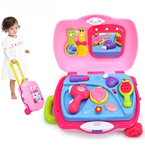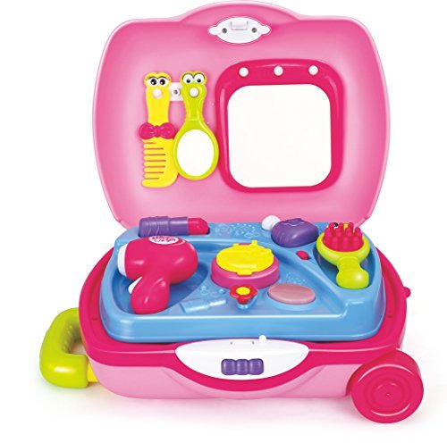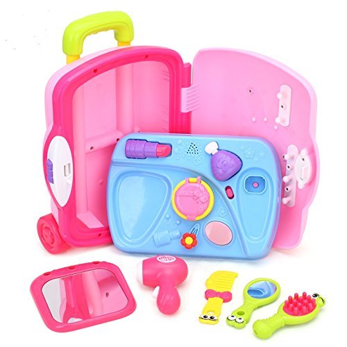 Advanced Play Beauty Salon Pretend Play set gives your little princess everything she needs. This beauty kit is ideal for creative play and realistic roleplay modeling It is featured with fashion beauty tools. Accessories includes mirror hair dryer, Comb, Flower Clip, jewel case, Hand Mirror, Lipstick, Lotion, and Brush. It is battery operated you can press the buttons to hear sounds, play songs and flashing lights There,s a big empty storage place for makeup accessories and for other toys. Compact enough to drag wherever she'll go in the car at friends or on her vacation. This cute toddler girl toys will surely lead them to be the future hair dresser and fashion Stylist. very neat and high quality preschool toys kit. Your #1 GIRL GIFTS CHOICE FOR ANY OCCASION! Birthday Holiday Christmas, etcFeature