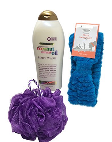 This bundle includes: 19.5 ounce OGX Extra Creamy + Coconut Miracle Oil Ultra Moisture Body Wash, 1 Plush Headband, 1 Bath Sponge.