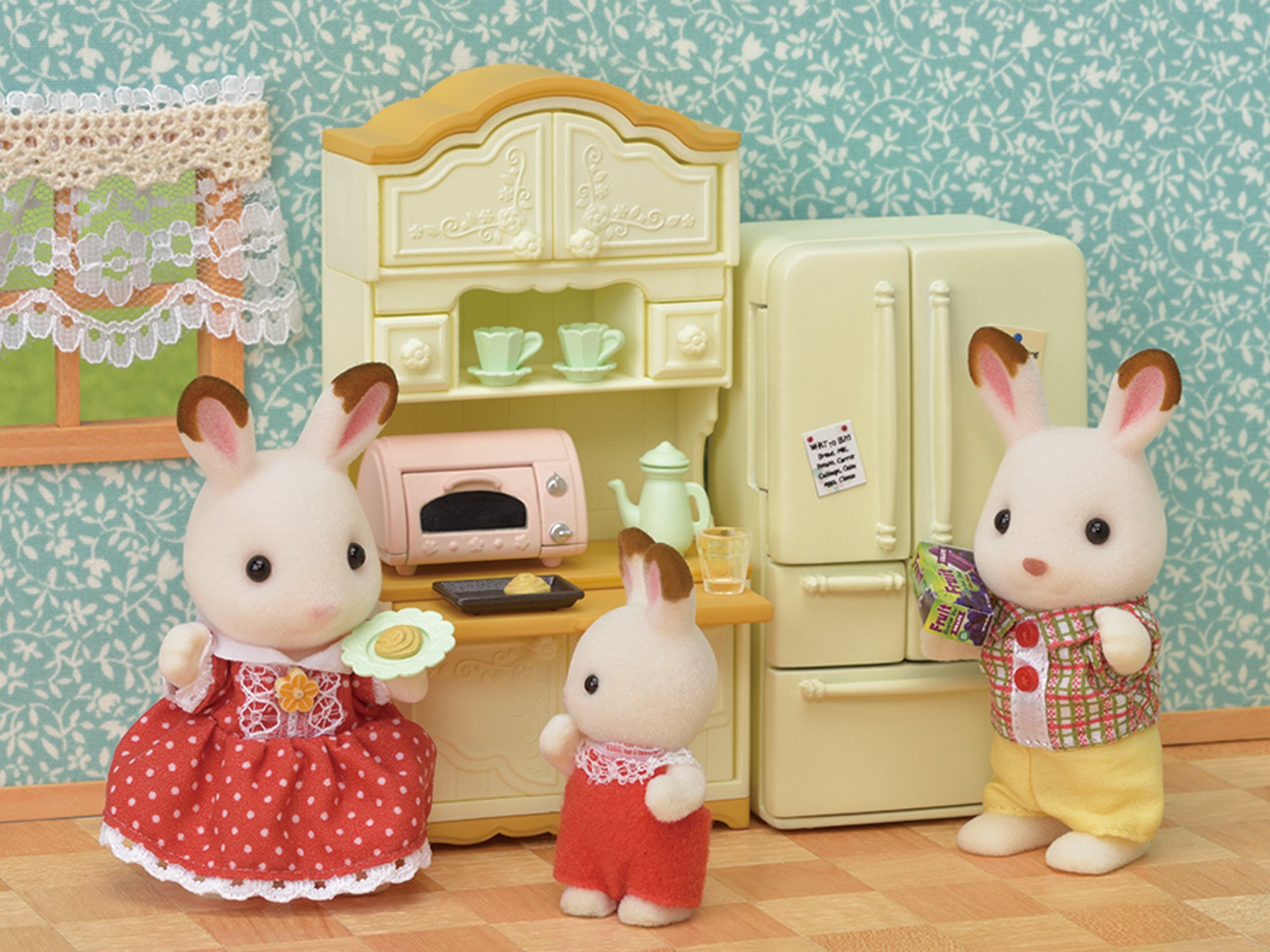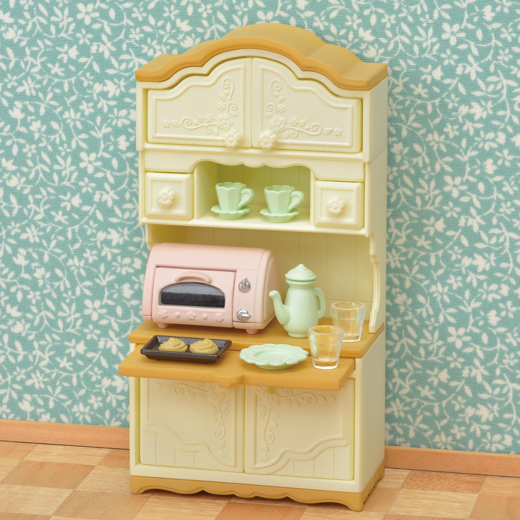 Cupboard, drawer x 2, toaster, toaster tray, cookie x 2, dish, pot, lid, cup x 2, saucer x 2, glass x 2 (total number of parts: 16)