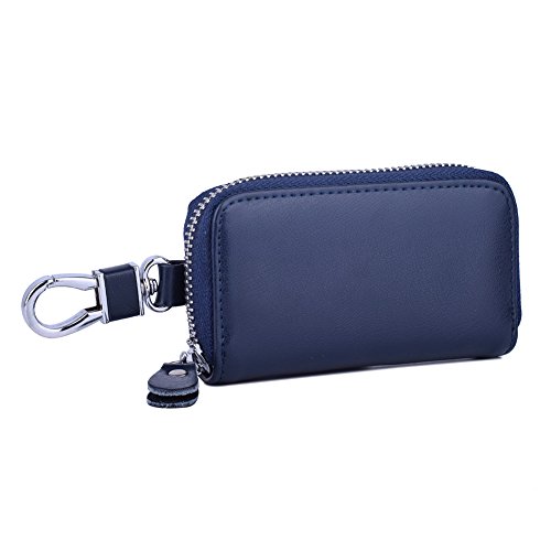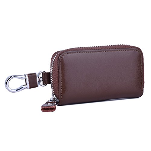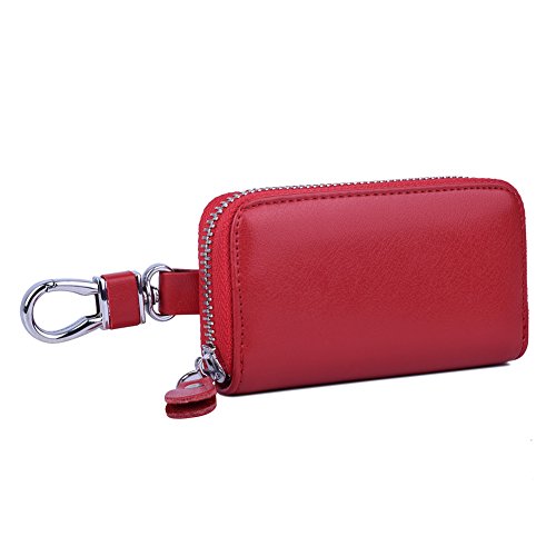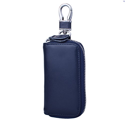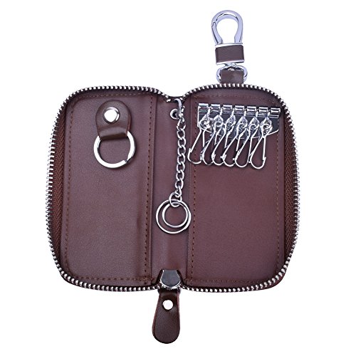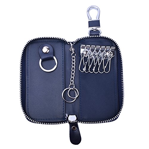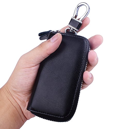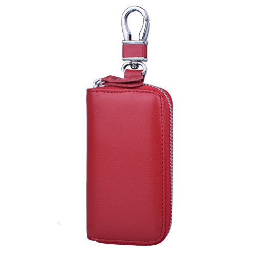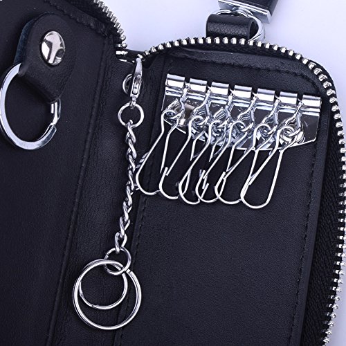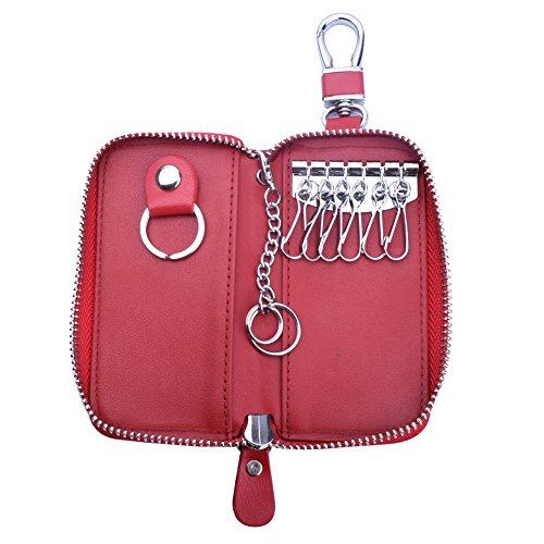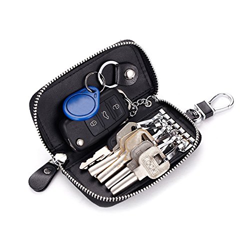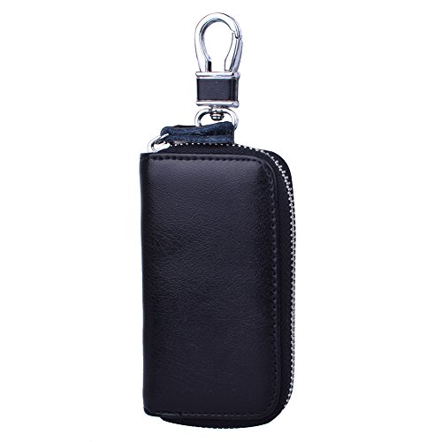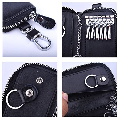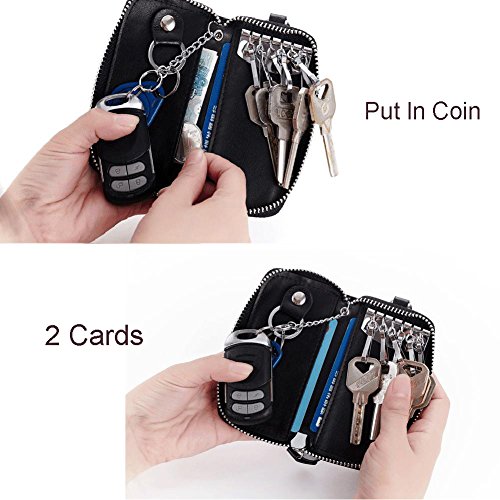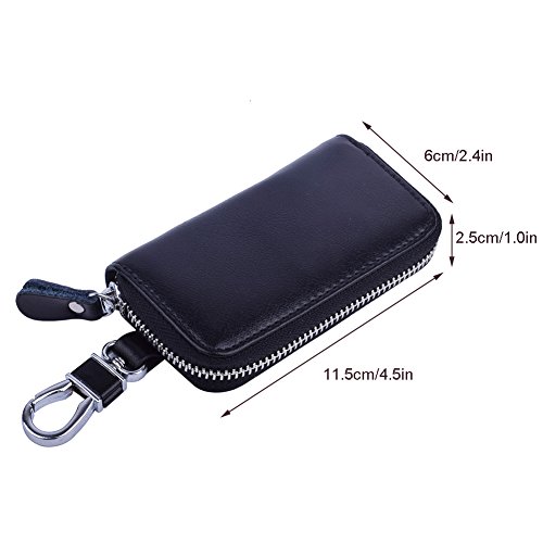 MATERIAL - Made of high quality genuine cow leather with fabric lining and soft hardware. SIZE: 4.5" x 2.4" x 1" (11.5 cm x 6 cm x 2.5 cm) . WALLET CASE STRUCTURE:6 key hooks, 1 big removable car key ring, 1 electronic key ring,2 cards holder. ZIPPER CLOSURE DESIGN - zipper around design keep your cards and money safe, easy in and out. PACKAGE LIST :1 x cow leather car key holder wallet.