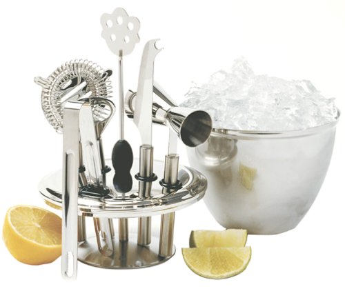 -. Feature : Lovely, 8 piece, household bar set / Includes: ice bucket, tongs, tool rack, strainer, bar knife, double jigger, stir stick, bottle opener / Stainless steel construction; mirror plated for visual appeal / Can use the 8pc bar set and ice bucket separately / Hand washing recommended
