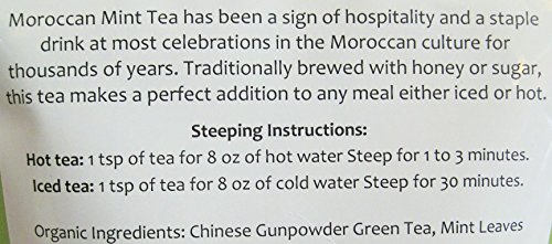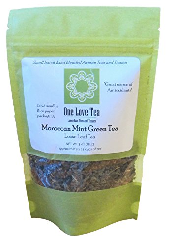 -. Binding : Misc. -. Brand : One Love Tea -. EAN : 0700686890680 -. Feature : One Love Tea - Small batch hand blended Artisan Teas and Tisanes / 1 bag of 3 oz loose tea, makes approximately 25 cups of tea / Great Source of Antioxidants / Organic Ingredients: Chinese Gunpowder Green Tea, Mint Leaves / Enjoy hot or cold. Contains Caffeine -. IsAdultProduct : 0 -. Label : One Love Tea -. Manufacturer : One Love Tea -. NumberOfItems : 1 -. PackageQuantity : 1 -. ProductGroup : Grocery -. ProductTypeName : GROCERY -. Publisher : One Love Tea -. Size : 3 oz -. Studio : One Love Tea -. Title : One Love Tea - Moroccan Mint Green Tea - 3 Oz Loose Leaf Herbal Tea -. UPC : 700686890680