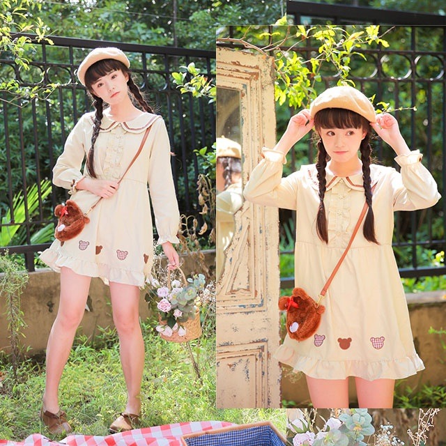 【森ガール】ワンピース 春 長袖 ショート丈 ワンピ フレア袖 フリル ワンピース セーラー襟 可愛い クマ刺繍 切り替え ワンピ ワンピース チュニック丈 学生 女子 女の子