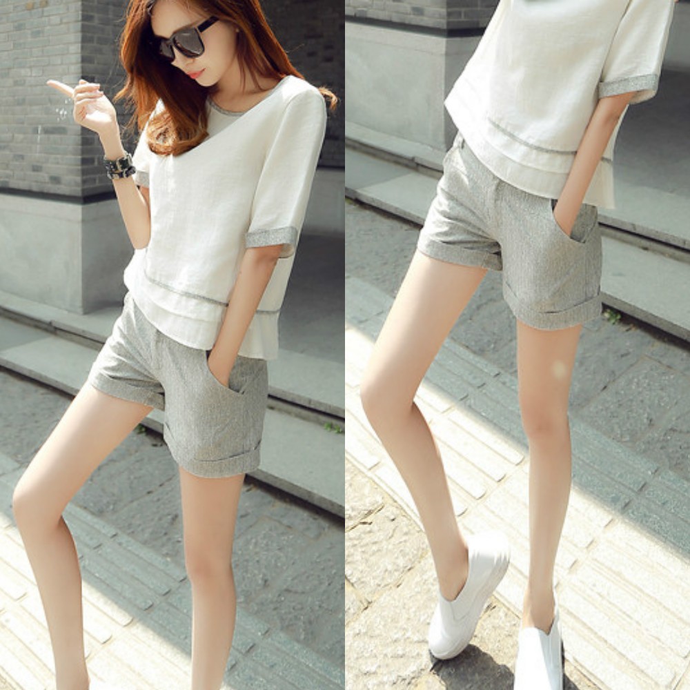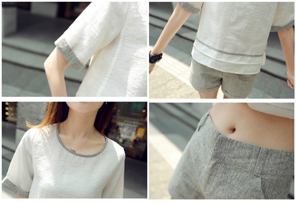 部屋着にも◎☆カジュアル リネン&コットン素材 コットンTシャツ&ショートパンツ セットアップ