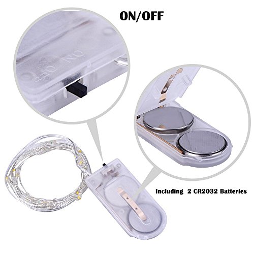 - 1. The string lights are powered by 2 x CR2023 battery (included!), which is with ON/OFF switch; no worries of where to find an outlet, simply switch on the lights and enjoy these amazing fairy lights for at least 30 hours.