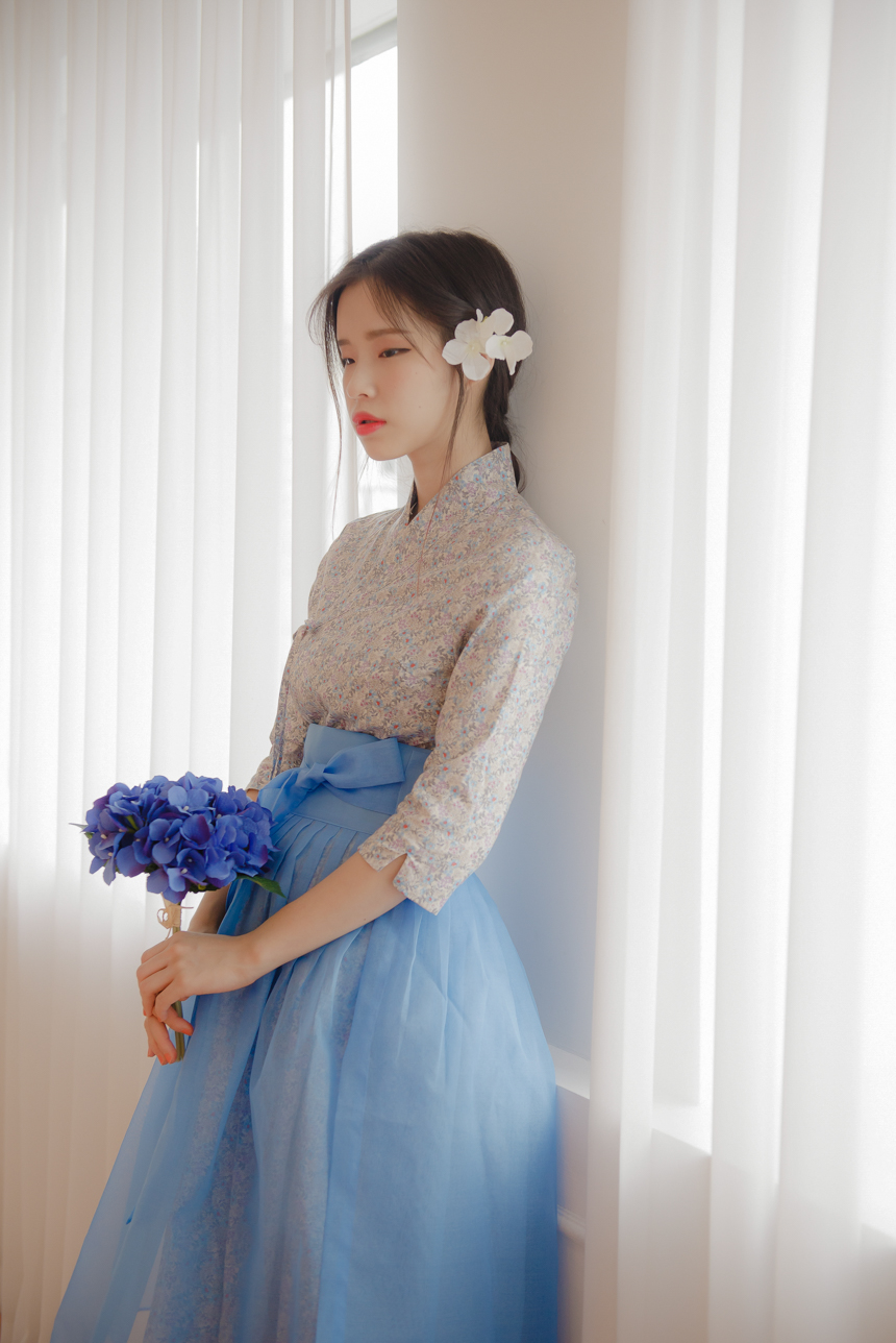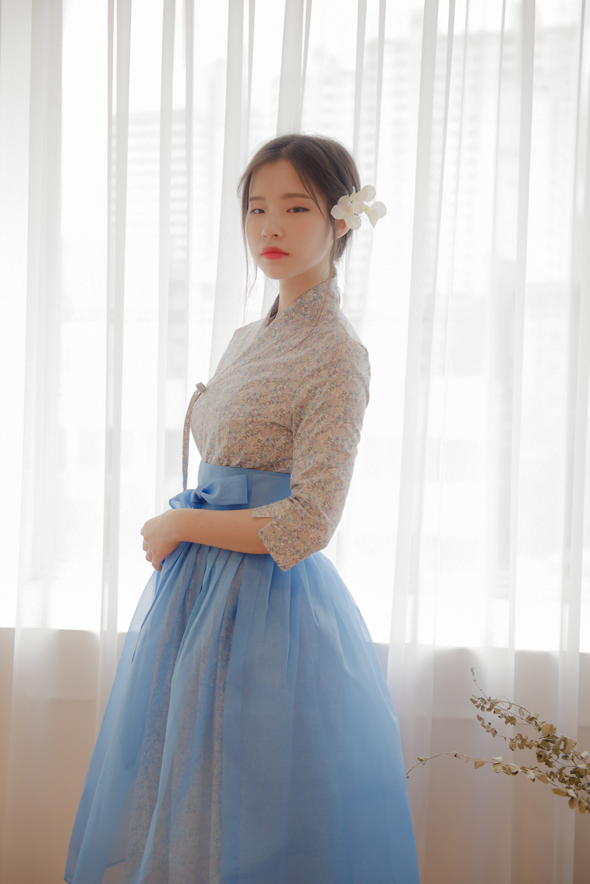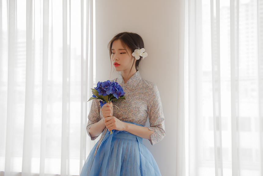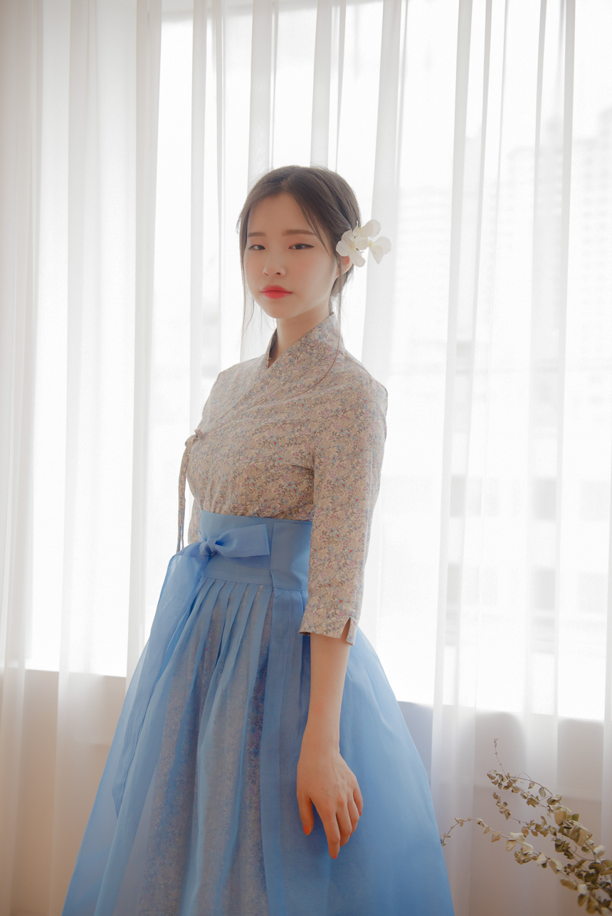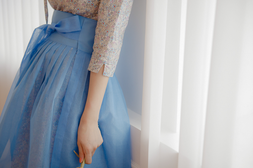 하늘색 한복원단 허리치마를 함께 코디해서 입으시는 꽃닮의 특별한 생활한복입니다.