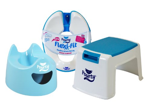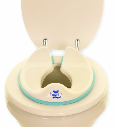 The new Flexi Fit Toilet Trainer from Pourty has a unique squeeze flex action and adjustable prongs so that it fits securely on to the toilet seat. Adult toilet seats come in many shapes and sizes and most potty seats have no size adjustments. This means that they can wobble around making the child feel insecure when they sit on them. The Flexi Fit's clever design allows you to adjust it once per toilet seat for a great secure fit each time. Its squeeze flex action enables you or your child to put it on and off the toilet easily. The potty seat is made from a sturdy and smooth plastic and is contoured to make it comfortable for the child to sit on with confidence. It also incorporates a full splash guard below and above the seat to prevent unwanted spills. The Flexi Fit comes in a stylish but discrete white with a blue rubber rim. Please note that the Flexi Fit may not fit as securely to large rectangular toilet seats.