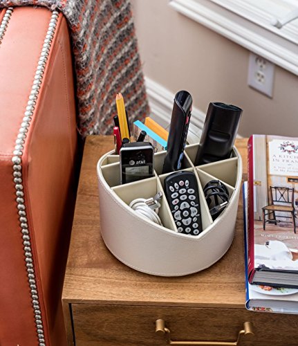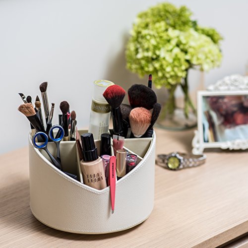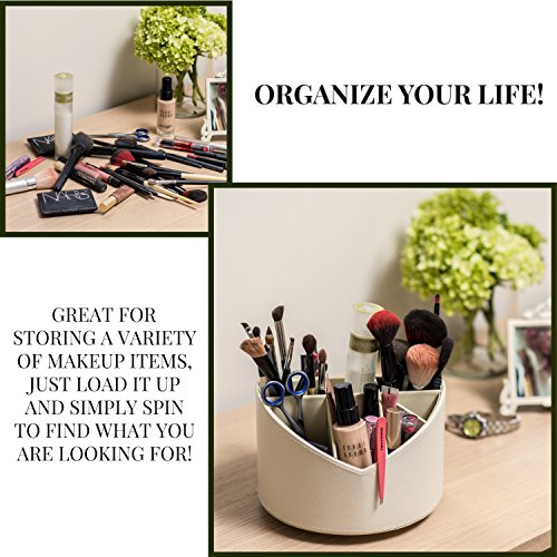 HOME ACCENT: The cosmetic brush organizer is covered in an elegant and durable crème colored faux leather with delicate stitching to keep your home decor looking stylish and chic while functioning as a spinning makeup holder