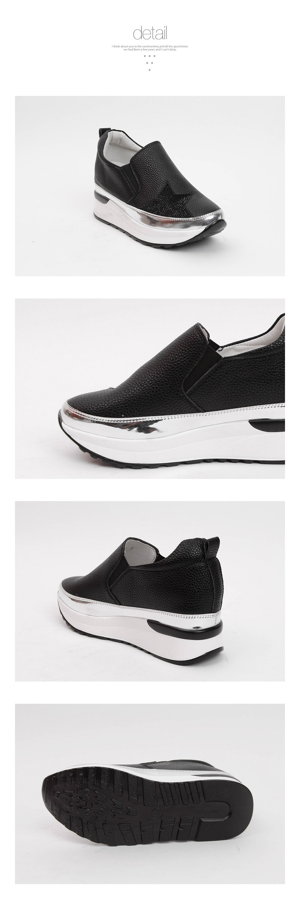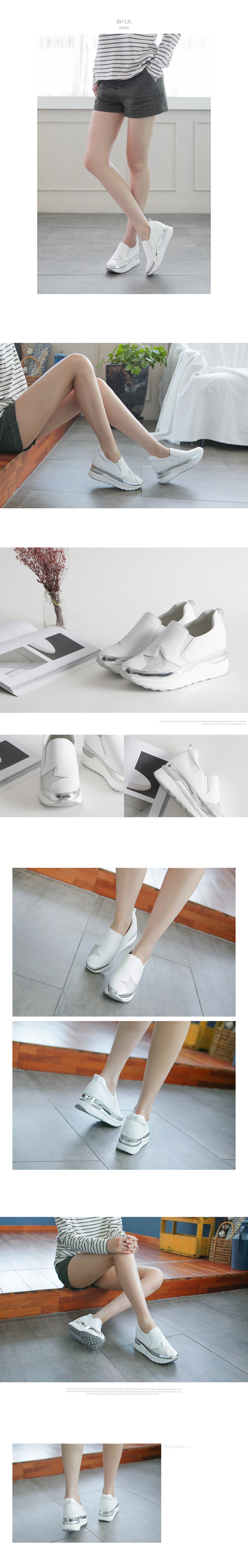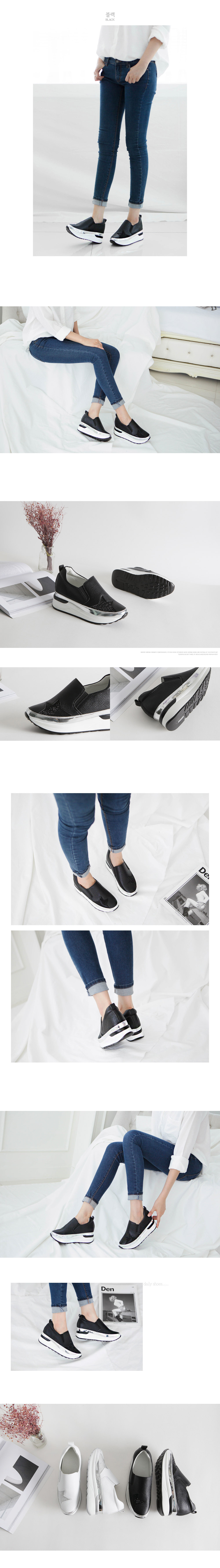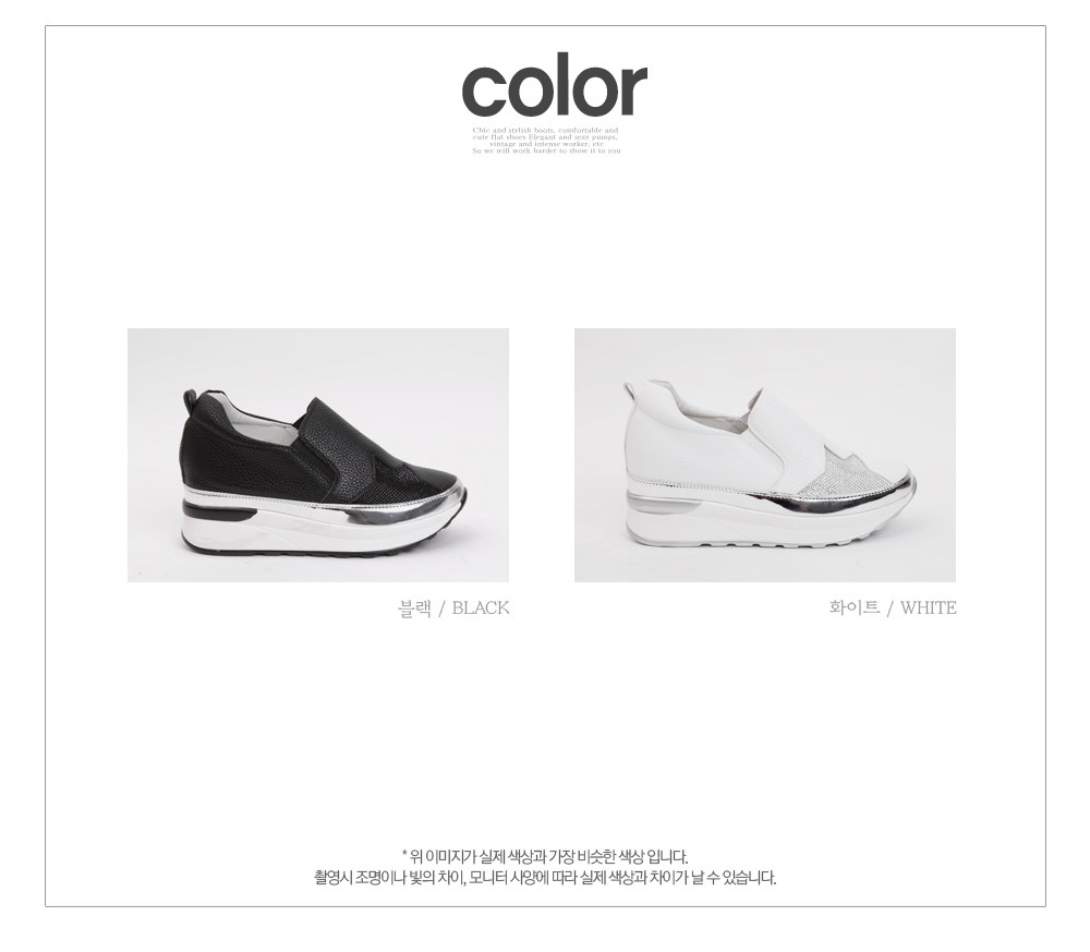 둥글린 라운드 토우로 발을 가지런히 모아주며 매끄러운 리얼소가죽 소재로 제작되어 고급스럽구요 ~ 발등위 별모양의 큐빅장식과 슈즈라인에 실버스트랩으로 포인트를 주어 멋스럽고 스타일리쉬한 매력이 넘치는 슈즈랍니다 양사이드에 신축성좋은 밴딩이 있어 신고 벗기가 간편하며 활동하기 편하구요 발을 전체적으로 감싸주는 디자인으로 들뜸없이 헐떡임 없이 편안하게 착화하실수 있어요 ~ 4cm굽과 3.5cm의 키높이 굽이 더해져 7.5cm의 굽높이로 다리라인을 슬림하고 길어 보이게 해주며 폭신폭신한 쿠션패드가 있어 충격을 흡수해 발의 무리를 덜어주어 편하게 신을수 있습니다 캐주얼한 디자인으로 어떠한 룩에도 멋스럽게 잘 어울리며 다양한 스타일에 매치하여 포인트 슈즈또는 데일리슈즈로 신기 좋은 활용도 높은 매력만점 슈즈로 추천해드립니다 활용도 만점의 데일리아이템 소개합니다.