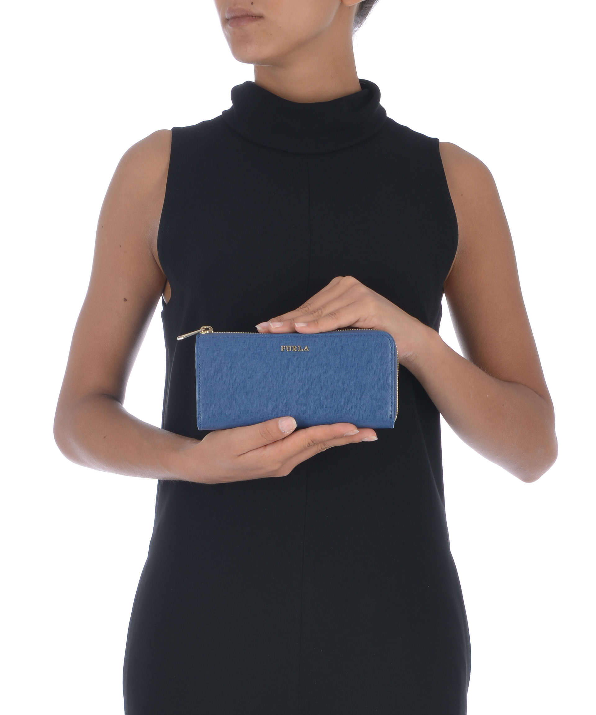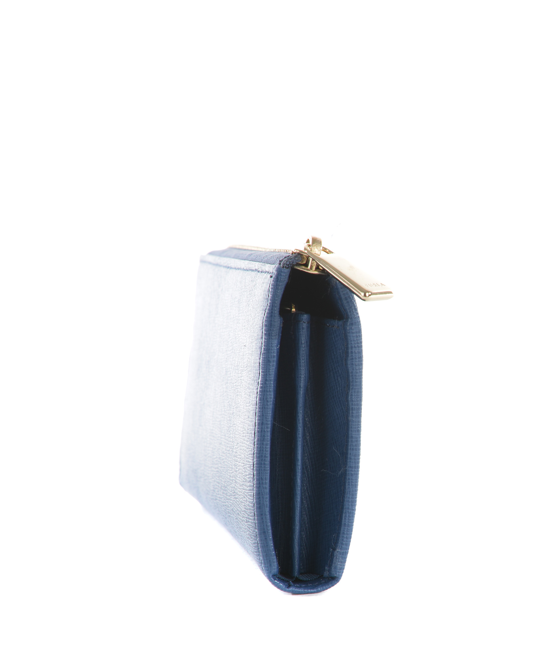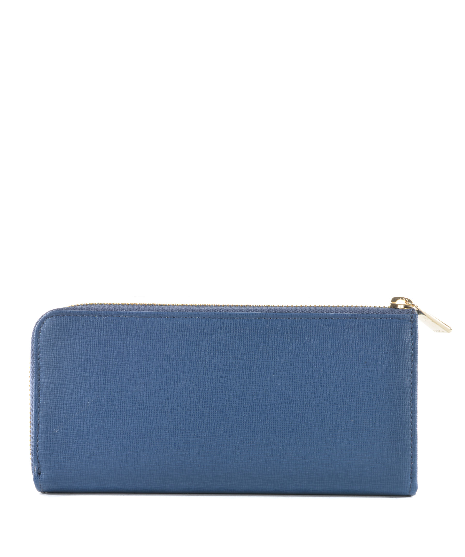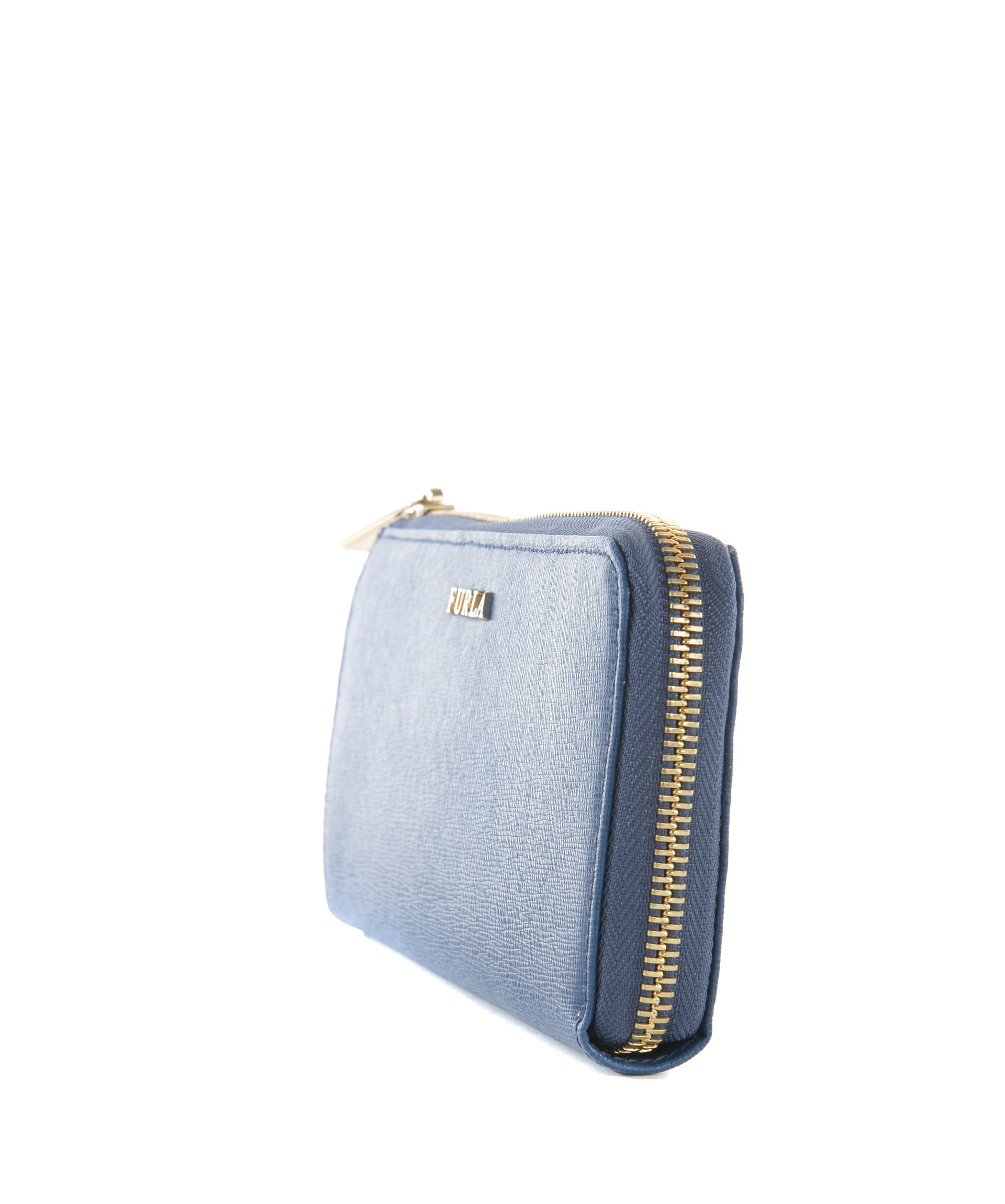 Portafogli Furla in pelle stampa saffiano Blu. Apertura con zip dorata. All'interno tasca centrale con zip, scomparti per banconote, tasche per carte di credito. Logo frontale in metallo dorato.