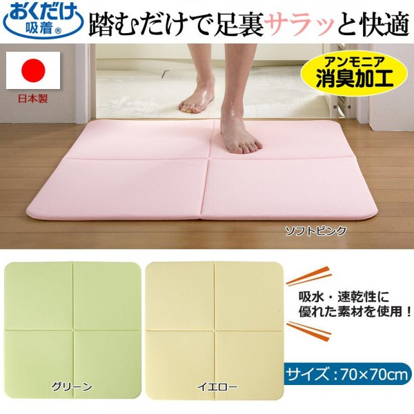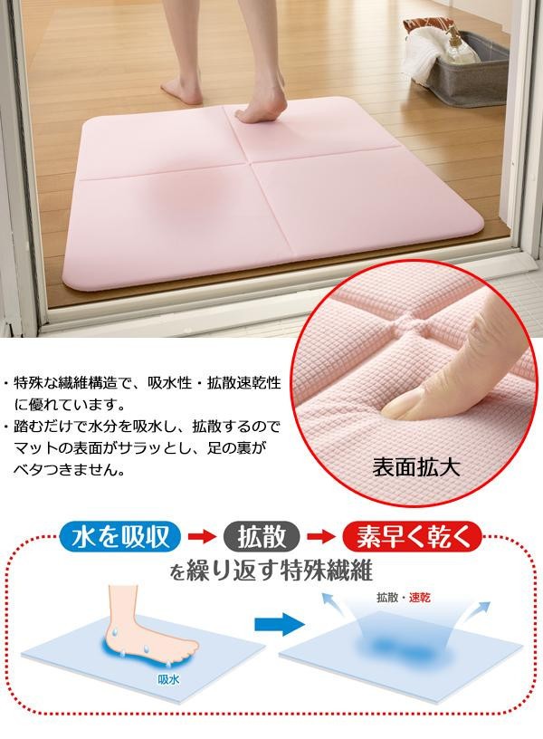 特殊な繊維構造で、吸水性・拡散速乾性に優れたバスマットです。踏むだけで水分を吸水・拡散するので、マットの表面がサラッとし、家族で使っても足の裏がベタつきません。また、裏面が床にピタッと吸着しマットのズレを防ぎます。芯材が入っていてフワッとした踏み心地で、ネットを使えば洗濯機で洗うことが可能です。 |