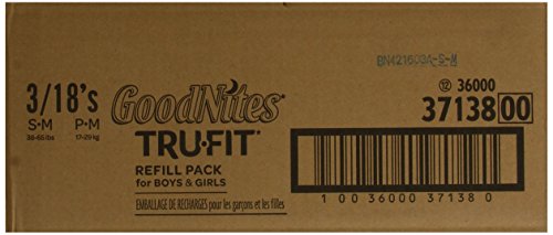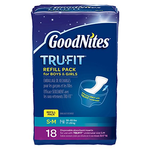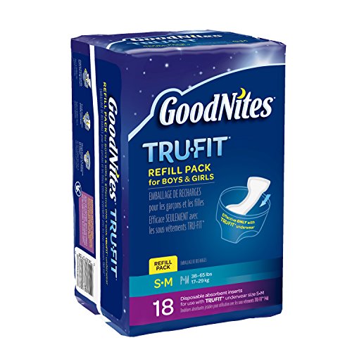 GoodNites TRU-FIT Disposable Absorbent Inserts are available in S-M for 38-65 lbs boys and girls (18 count), and L-XL for 60-100 lbs boys and girls (16 count)