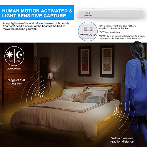 - Protect You in Dark: With motion and human body passive infrared sensor, warm soft white glow will turn on under bed once your place your feet on the ground which helps you to across your room safely without bumping on furniture and step on bugs on the floor.